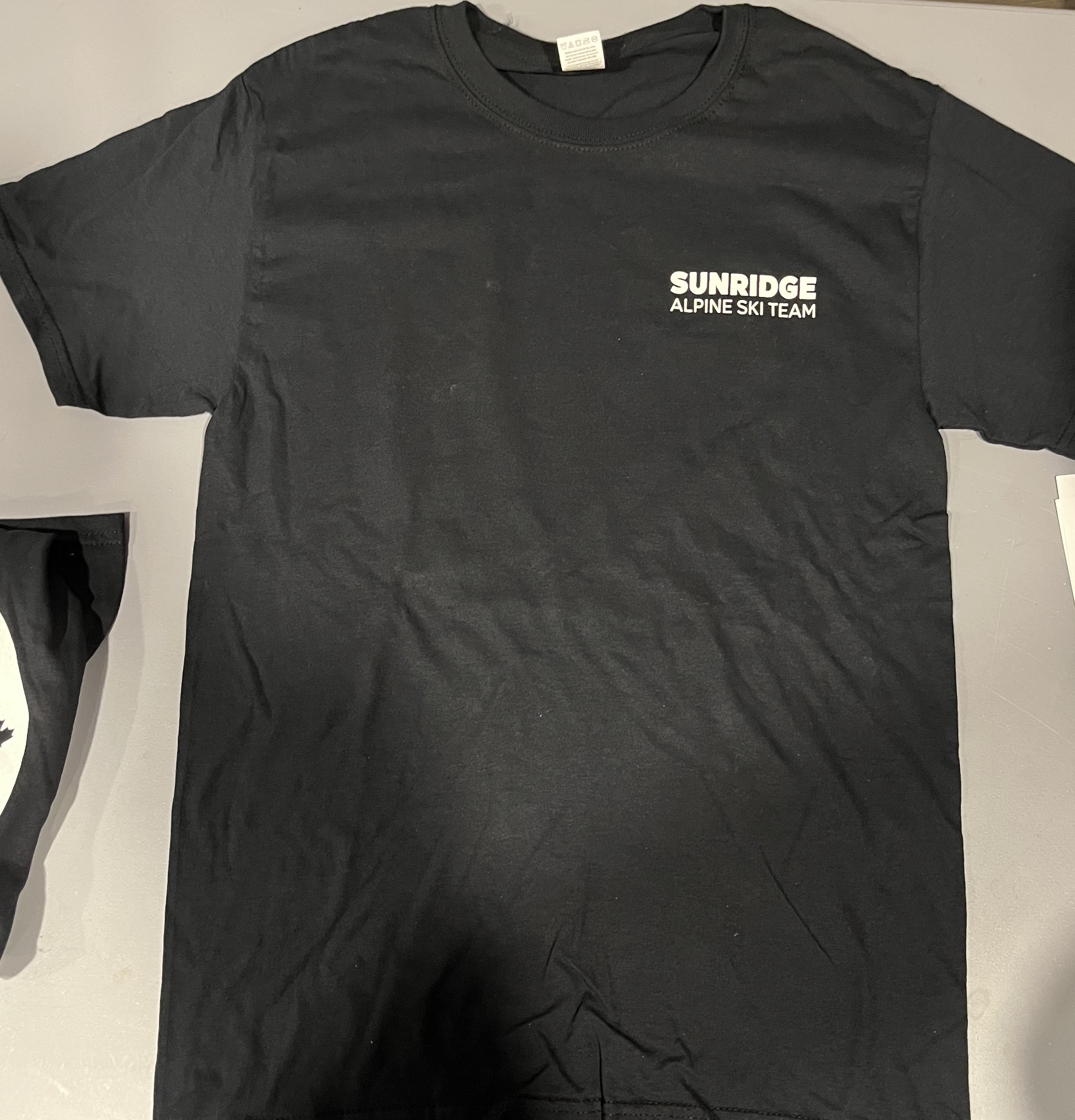 New for the 2022-2023 season! Black 100% cotton T-Shirt with Sunridge Logos. Note sizes are in Unisex Adult.