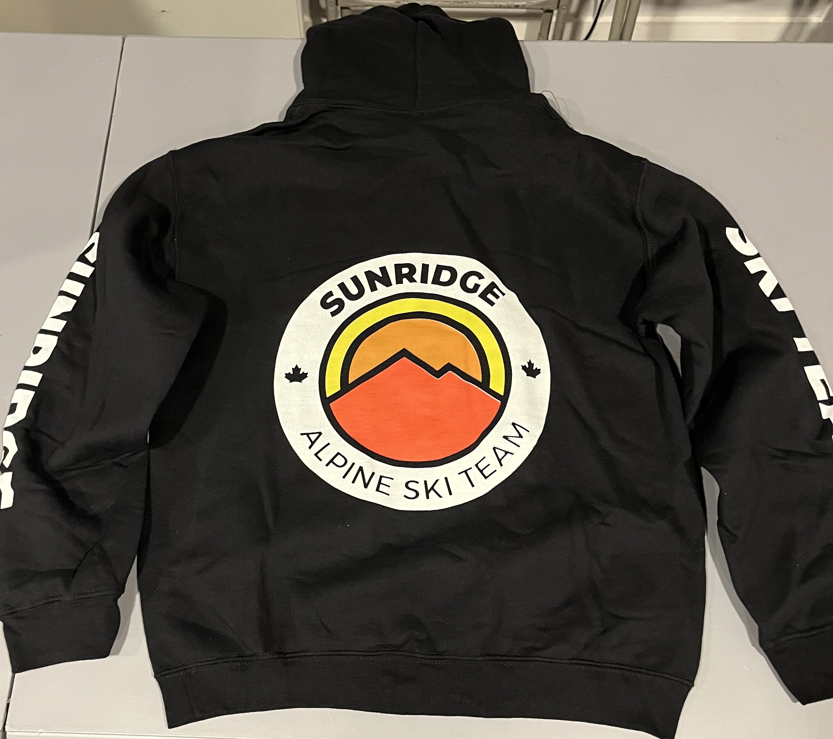 Black 50/50 cotton/polyester fleece, double lined hood with drawstrings hoodie with Sunridge Logos Note sizes are in Unisex Adult